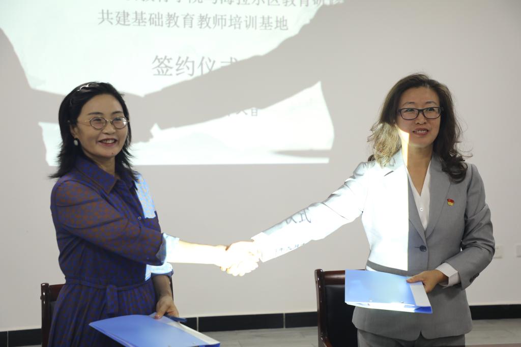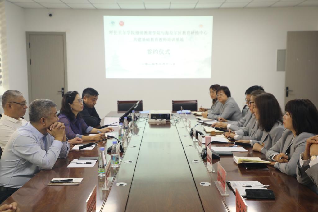 9月18日下午,太阳成集团官方网站与海拉尔区教育研修中心共建基础教育教师培训基地合作协议签约仪式在海拉尔区教师研修中心二楼会议室举行。公司党总支书记李健、经理莎茹莉及班子成员,海拉尔区教育研修中心主任胡慧婷及班子成员、各科室负责人参加了签约仪式。