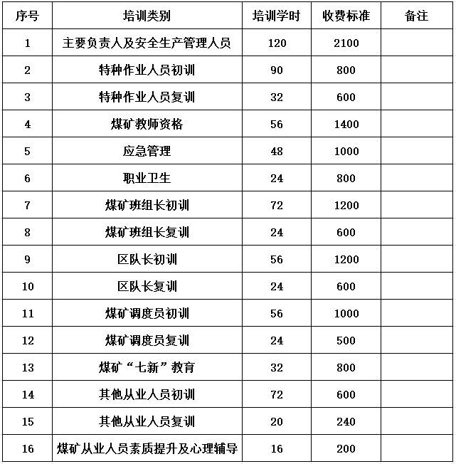 为进一步规范煤矿安全生产培训,根据《内蒙古自治区发展和改革委员会关于核定煤矿安全培训收费标准有关问题的函(内发改费函【2017】132号)》等文件精神,根据企业需求,自愿报名参加的原则,面向煤矿企业开设煤矿安全生产培训,收费标准公示如下: