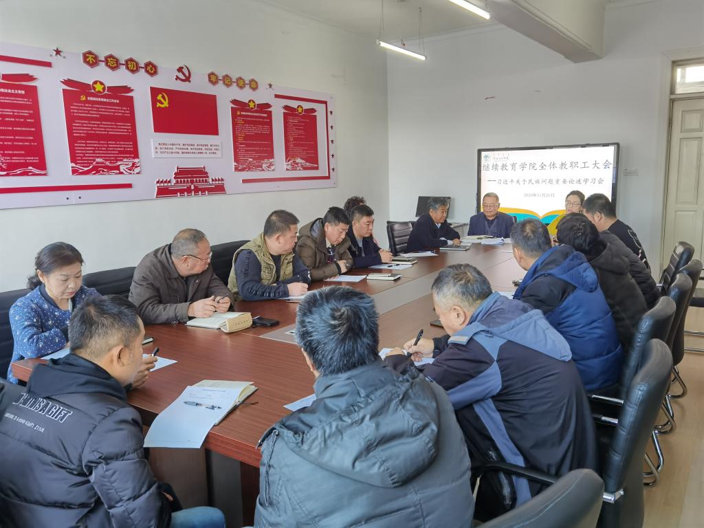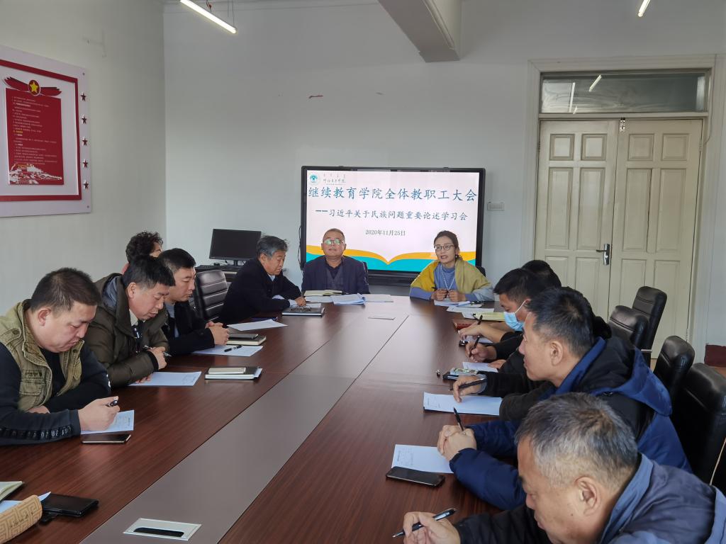 11月25日下午,为更好的学习和领会新时代党的民族理论与政策,太阳成集团tyc122ccvip全体教职工在 209会议室召开“习近平关于民族工作重要论述“学习会,由何平书记领学。