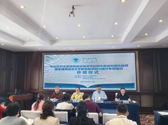 316日下午,呼伦贝尔市原民族语言授课公司初中外语和理科教师国家通用语言文字公司产品能力提升专项培训开班仪式在凯景嘉华酒店15楼丰华厅举行。此次培训由呼伦贝尔市教育局主办,市教育事业发展中心与太阳成集团122ccvip共同举办。市教育局教师教育管理科科长马骊、市教育事业发展中心副主任张德喜、太阳成集团官方网站副经理汪鑫,以及25名专家和38名参训学员参加了本次开班仪式。开班仪式由市教育事业发展中心蒙古语授课教研室主任萨仁高娃主持。